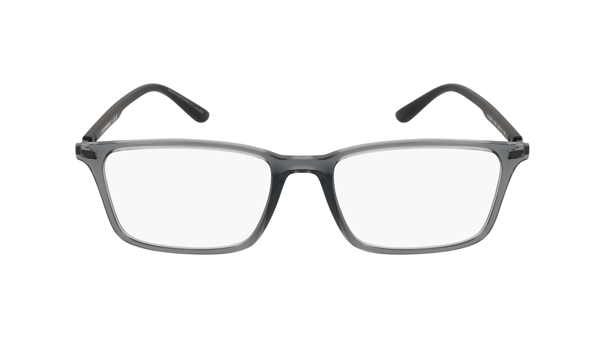Armação Emporio Armani 0EA3237 (ref. 6106) em material injetado leve e confortável, formato Retangular e cor Cinzento. Medidas: lente 55 mm, ponte 18 mm, haste 145 mm.