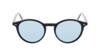 Lisboa Sol: O clássico redondo, em acetato, tamanho 51 em preto brilho, com lentes azuis