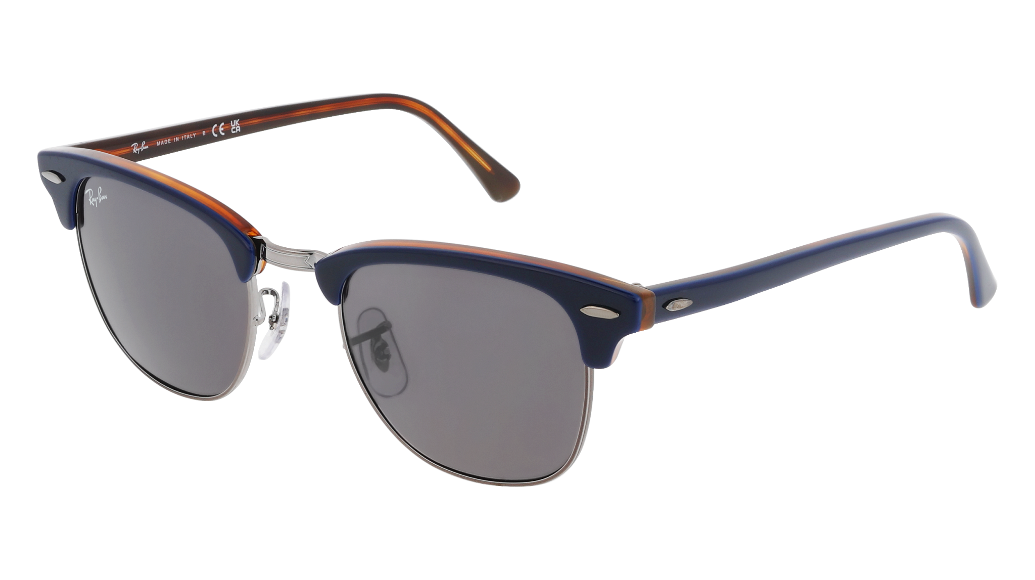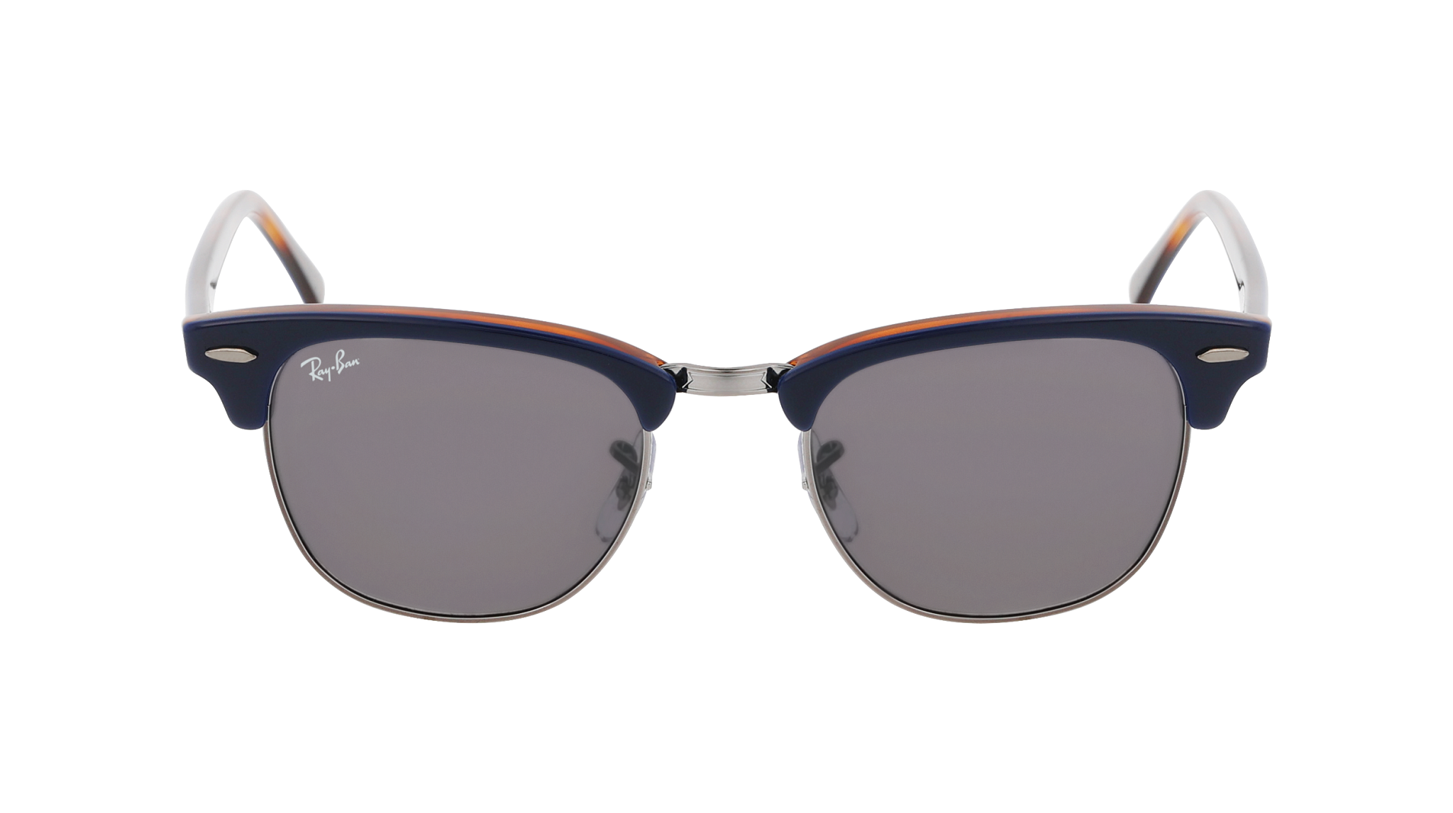 Os óculos de sol Ray-Ban RB3016 Clubmaster 1278B1 destacam-se pelo formato quadrado e pela estrutura em acetato, na cor Azul Cinzento-chumbo, criando um visual com linhas marcantes.