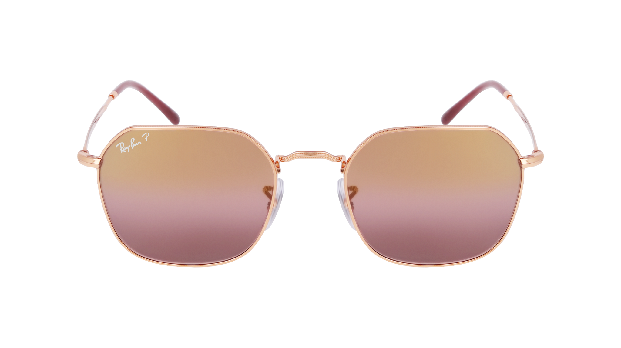Os óculos de sol Ray-Ban RB3694 Jim 9202G9 destacam-se pelo formato irregular e pela estrutura em metal, na cor Ouro Rosa, criando um visual diferenciador e contemporâneo.