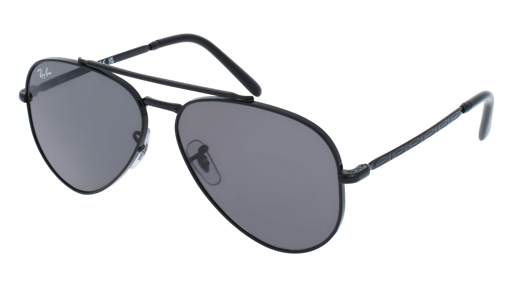 Óculos de sol Ray-Ban RB3625 New Aviator 002/B1 unissexo, formato aviador em metal, cor Preto. Lentes em cinzento-escuro. Medidas 57-14-135 mm.
