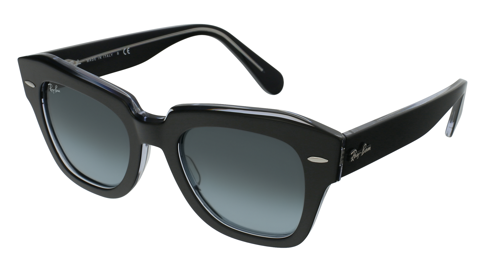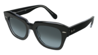 Óculos de sol Ray-Ban RB2186 State Street 12943M unissexo, formato quadrado em acetato, cor Preto sobre Transparente. Lentes degradê em azul. Medidas 49-20-145 mm.
