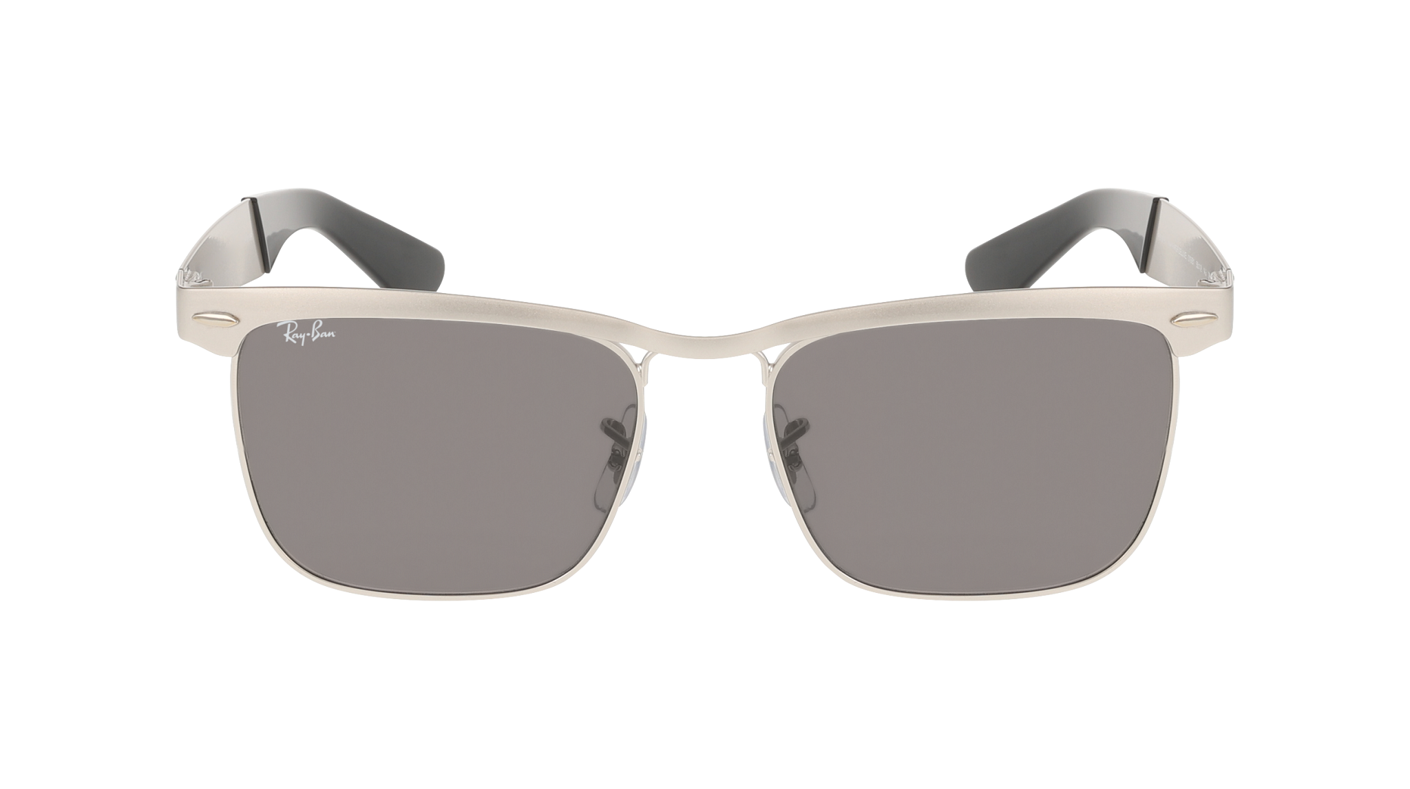 Os óculos de sol Ray-Ban RB3875 Wayfarer Deluxe 019/B1 destacam-se pelo formato quadrado e pela estrutura em metal, na cor Prata com jato de areia sobre prata, criando um visual com linhas marcantes.