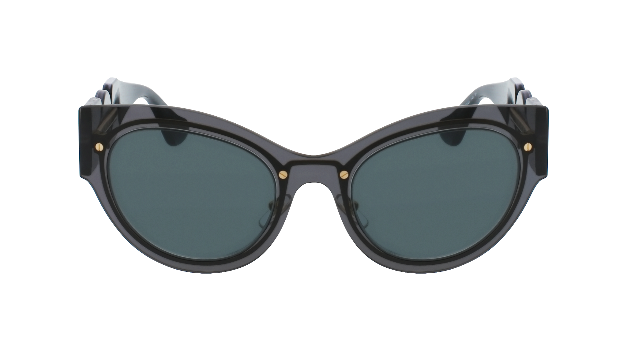 Óculos de sol Versace 0VE2234 100287 de senhora — formato borboleta • com aro completo • armação cinzento-escuro transparente • lentes cinzento-escuro. Design equilibrado para quem procura impacto…