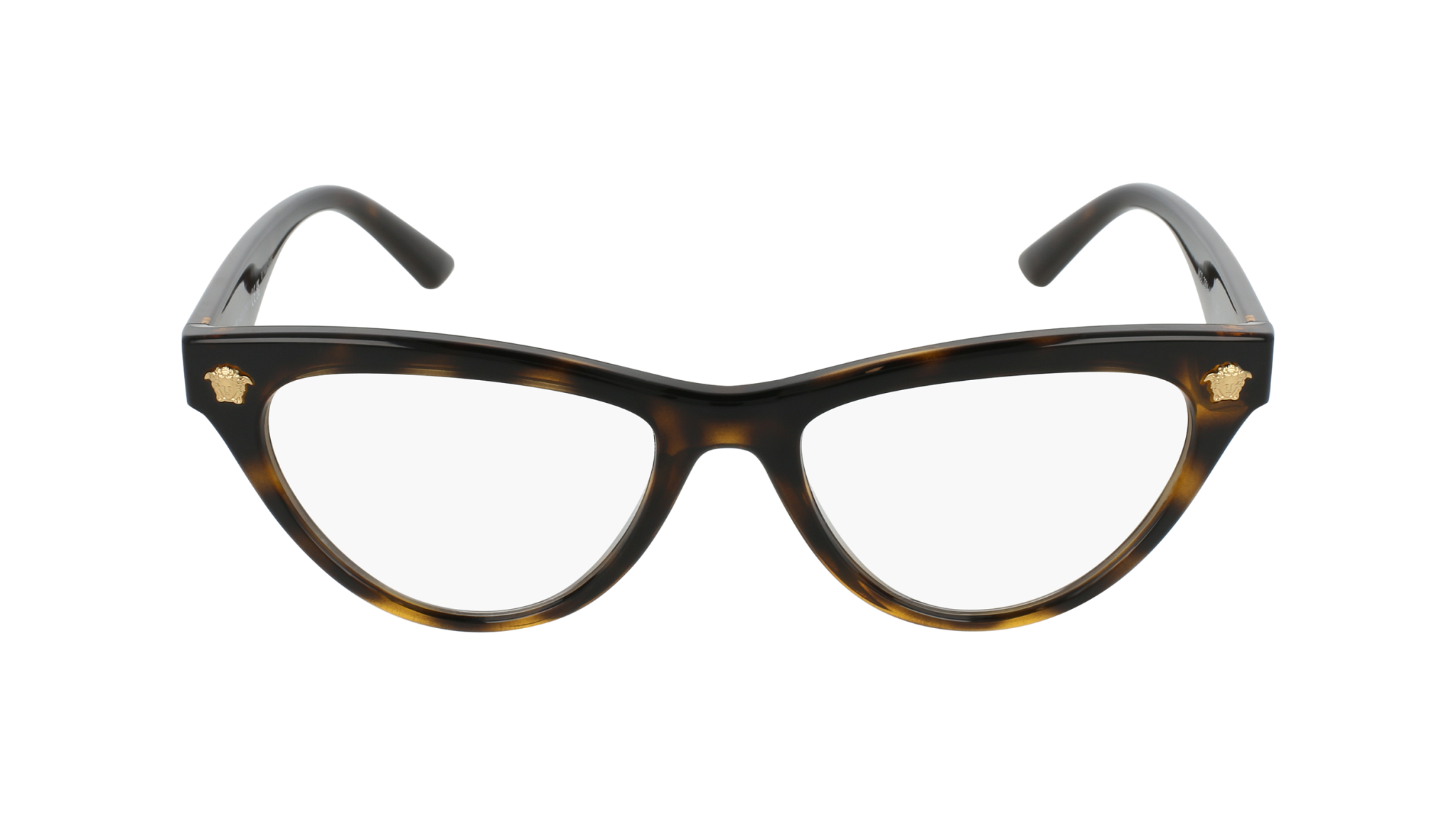 Óculos graduados Versace 0VE3364U 108 – formato olho de gato, armação em material injetado, cor Havana, calibre 52 mm. Para senhora, ideal para lentes graduadas.